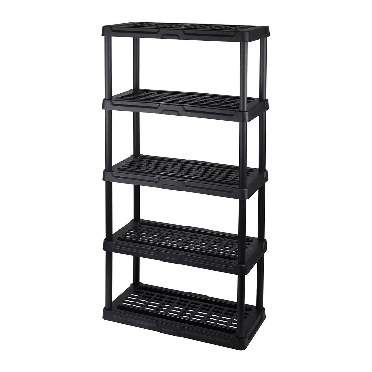 - This 5-tier storage rack is designed to free up space in any shop or garage. Constructed from durable polypropylene, the rack won’t dent, rust, or peel. The shelves are engineered to hold up to 150 lb. each.